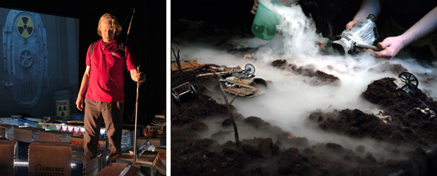 “Een apocalyptische revue met oude boeken, korte films, beelden van Na De Bom, pop art-science fiction, kabouters en dichters. We vertonen een zelfgemaakte rampenfilm, een diaserie over de schoonheid van vergissingen en we laten fragmenten horen uit het logboek van de kapitein van een ruimteschip dat al 500 jaar de weg kwijt is.”