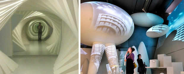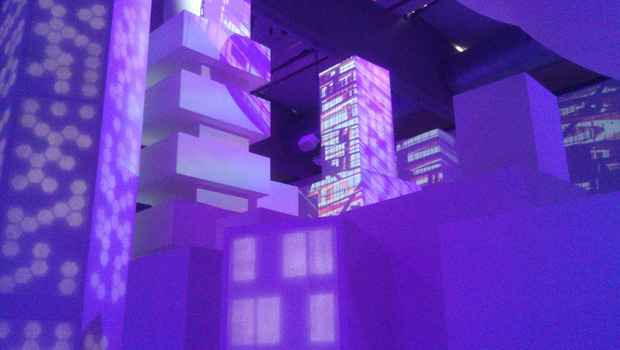Opnieuw het gespeel met het licht en de spiegels wat een erg leuk effect oplevert. In deze kamer staan een flink aantal witte blokken van verschillende vormen en formaten. Op de blokken worden doormiddel van beamers verschillende projecties gemaakt. In combinatie met de lichtveranderingen krijg je hierdoor een tal van mogelijke toekomstbeelden. Vol verbazing sta ik te kijken naar omkeerbare voetbalvelden, veeflats en gebouwen met parken erin verwerkt. Dit is het leukste gedeelte van de tentoonstelling. De verschillende mogelijkheden van architectuur worden op een interessante manier weergegeven en het blijft verbazing wekken wat de toekomst allemaal voor ons in petto heeft.