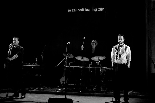 Het zorgt voor donkere cantate’s die soms doen denken aan Laurie Anderson – de elektrische viool helpt daarbij- en elders aan de gezongen litanieën van Nick Cave. En ergens tussen Cave, Anderson en zeg maar John Cage als derde ophangpunt, hebben Pawlowski en Delbeke hun muzikaal web gespannen waarin alle acteurs muzikanten zijn: Femke Heijens met heldere zangstem als heks èn als Macduff, Koen van Kaam in vele rollen waaronder die van een enthousiast banjo spelende Banquo en Sofie Declair als duistere pauken spelende Lady Macbeth.