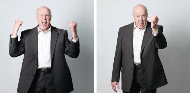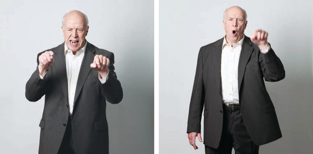 Voor de goede beschouwer maakt Woudenberg in de eerste scene ook gebruik van Hitlers gesticulaties, maar hier past hij eveneens een neutralisering toe. Het in moderne ogen groteske expressionisme van Hitler, wat toen op de bühne voor realisme doorging, vertaalt Woudenberg sober maar herkenbaar naar overtuigend vastberaden bewegingen.